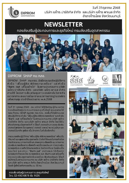 DIPROM SHAP กม.กสอ. จัดฝึกอบรมเชิงปฏิบัติการ หัวข้อ "เพื่อนคู่คิด พิชิตความเครียด" และหัวข้อ "Burn out แก้ไขอย่างไร" ในสถานประกอบการ บริษัท เมโทร ปาร์ติเกิล จำกัด และ บริษัท เมโทร พาเนล จำกัด