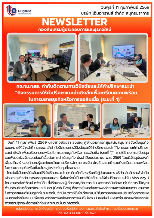 DIPROM กม.กสอ. กำกับติดตามการวินิจฉัยและให้คำปรึกษาแนะนำ "กิจกรรมการให้คำปรึกษาเชิงลึกเพื่อเตรียมความพร้อมในการขยายธุรกิจหรือการขอสินเชื่อ (ระยะที่ 1)" ณ บริษัท เอ็มอีทรานส์ จำกัด สมุทรปราการ